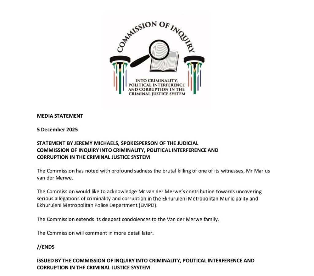 Van der Merwe had played a central role in exposing alleged criminality and corruption within the Ekurhuleni Metropolitan Municipality and the Ekurhuleni Metropolitan Police Department (EMPD). His testimony had formed part of the Commission’s ongoing probe into organised crime networks and political interference in law-enforcement structures.